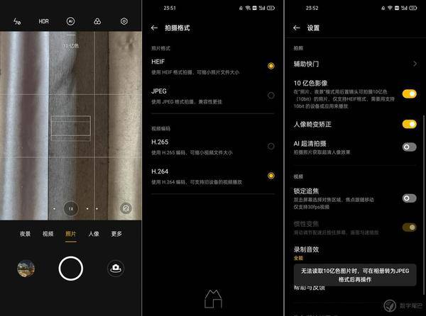 图片方面:只需在设置中打开“10亿色影像”,并将照片格式选择为HEIF,即可使用三摄拍摄10亿色色彩,拥有更平滑的过渡。