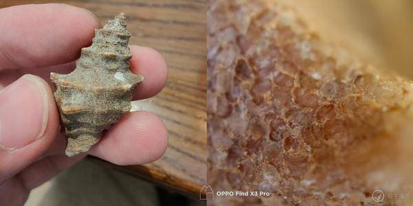 我们直接给到一组有趣的拍摄,五一在海边吃螺,吃完之后可以通过OPPO Find X3 Pro的显微镜头看到,原来海螺的表面是丰巢结晶状堆叠而成,这改变了我之前的认知。