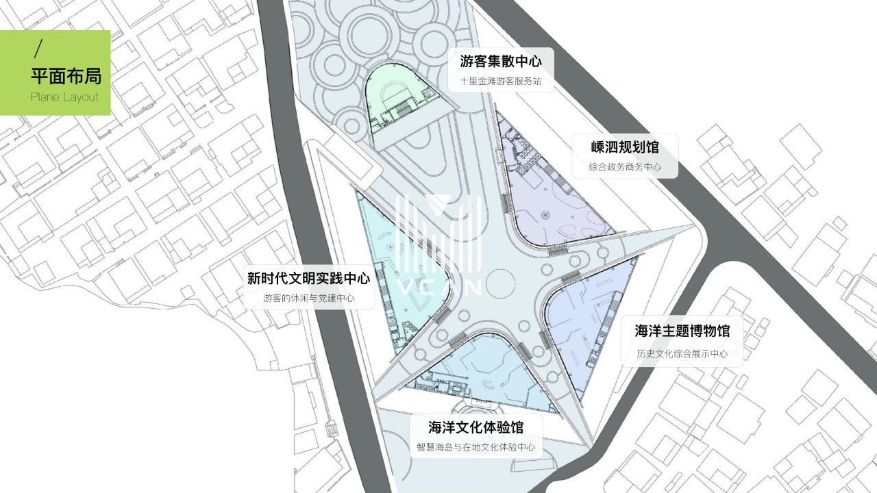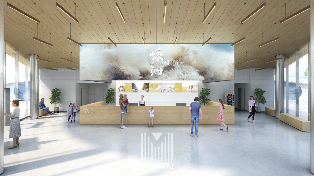 在设计之初,我们把嵊泗·⼗⾥⾦滩需要向外的呼声与向内的承载定为主题,通过嵊泗规划馆、嵊泗渔场博物馆、海洋⽂化体验馆、⼗⾥⾦滩游客服务站加上海岛书店(新时代⽂明实践所)这“四馆一中心”作为小镇“窗口”,将综合性、开放性、⽂化性、体验感、延展性融入每一处细节,运用海洋⽂化与休闲展示相结合的⼿法,为⼗⾥⾦滩特⾊⼩镇打造出集旅游,展示,规划,休闲四位⼀体的全景化体验空间。