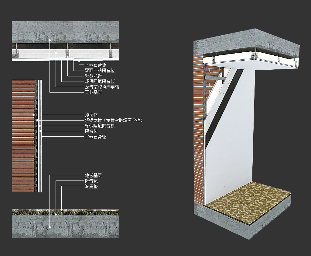 家居噪音主要来自户外和楼板噪音,隔音窗能很好的解决户外噪音。楼板噪音是周围邻居活动产生的噪音,比如脚步声、托桌椅、摔门等,能通过楼板和墙体传递好几个楼层,所以顶楼一样有噪音。房子质量不好隔音很差,楼板薄的楼上噪音特别吵。家庭隔音工程就是在家里建立一套顶、地、墙、窗、门的全方位噪音防御系统,将噪音降低到合理范围,白天45分贝以下,夜晚35分贝以下,保证正常生活不受其影响。隔音工程有一定厚度,吊顶10-18公分,墙体4-9公分,毛坯地面无厚度增加。根据现场情况,选择最合适的方案,家里就能实现“酒店客房式”的安静效果。