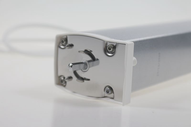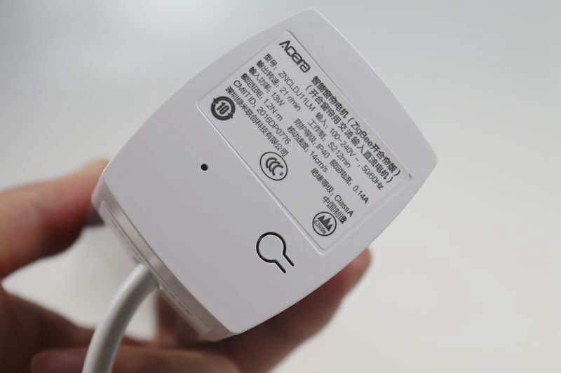 电机的底部除了标签之外还有一个实体按键,是电机重置或者初次与手机连接时的匹配按键,下方的小孔是指示灯孔,可指示电机不同工作状态,由于笔者装上了接线插头,就事先在安装到墙上之前就与手机进行匹配,这样就避免了在安装到墙上后位置较高不方便匹配的情况。