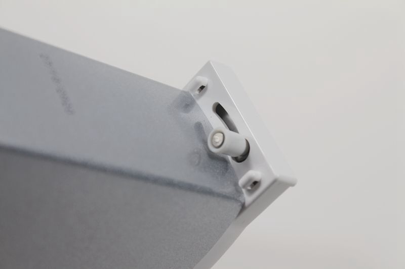 我们都知道电机工作原理是旋转,所以当窗帘左右方向运动的时候,电机需要固定,我们可以看到中间的转轴是电机,在电机两侧各有一个半圆形的卡扣,是和滑轨固定,这样就不会脱落。