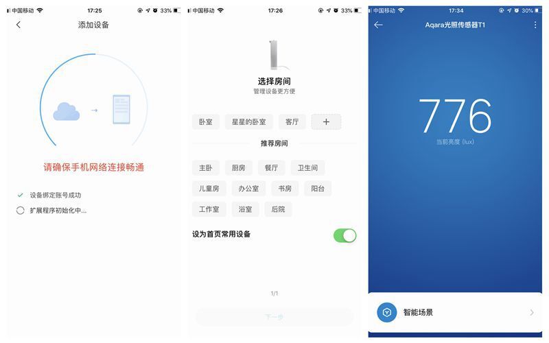 前面我们已经提到过了,WiFi支持2.4GB,不支持5GB,初次使用需要联网,设置客厅、卧室等场景,同时把Aqara光照传感器 T1贴到适当的位置。
