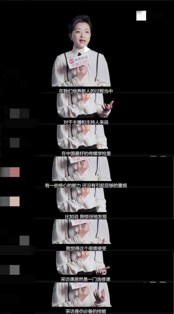 随后杨澜也批评了当今主持人行业乱象,她说今天的主持人和主播似乎并不看重一些专业能力,而采访作为主持人的必备技能,居然在中国一些知名的传媒学校被设为选修课,她感到很惊讶。