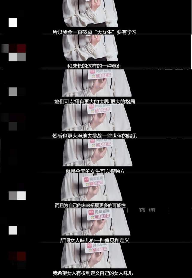 她还说女生也要有自我意识,勇于挑战世俗的偏见,独立自主开拓未来,并且可以挣脱“女人味”的偏见和定义,做自己的“大女生”。