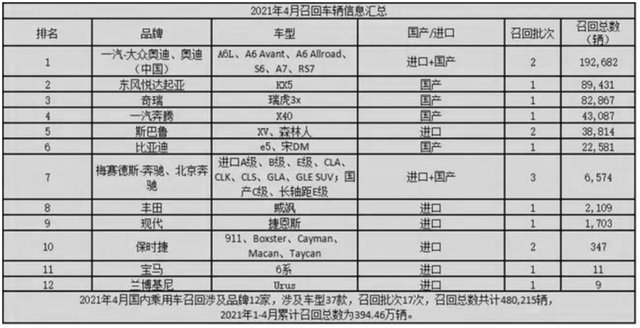 月,国内乘用车12个品牌共发布了17起召回公告,召回乘用车数量总计480,215辆,1-4月份累计召回超过394万辆。相比上月约277万辆的召回总数有较大回落,但是涉及的品牌数量、款型、批次仍然较多,诸多隐患仍在持续改进中。