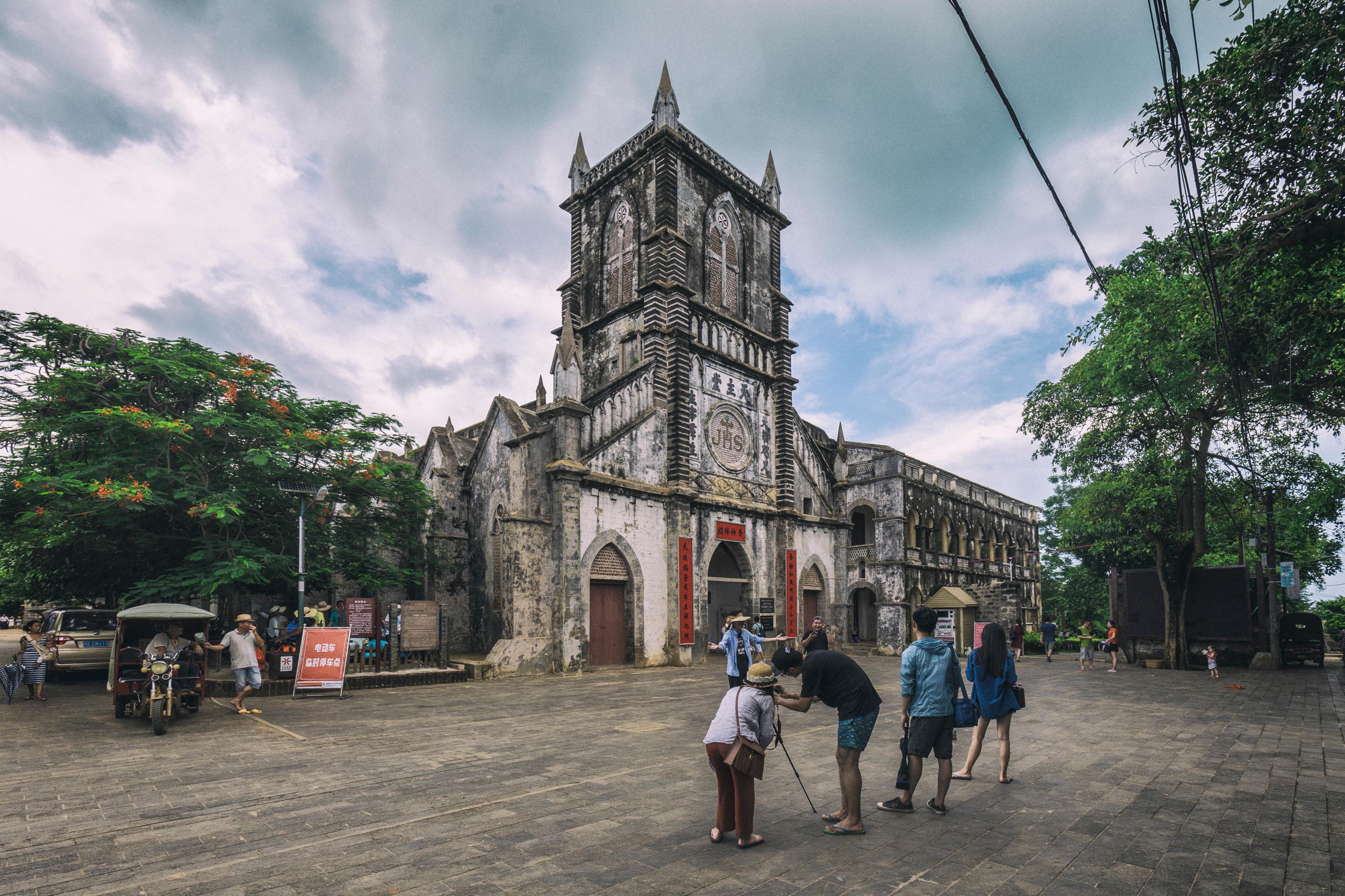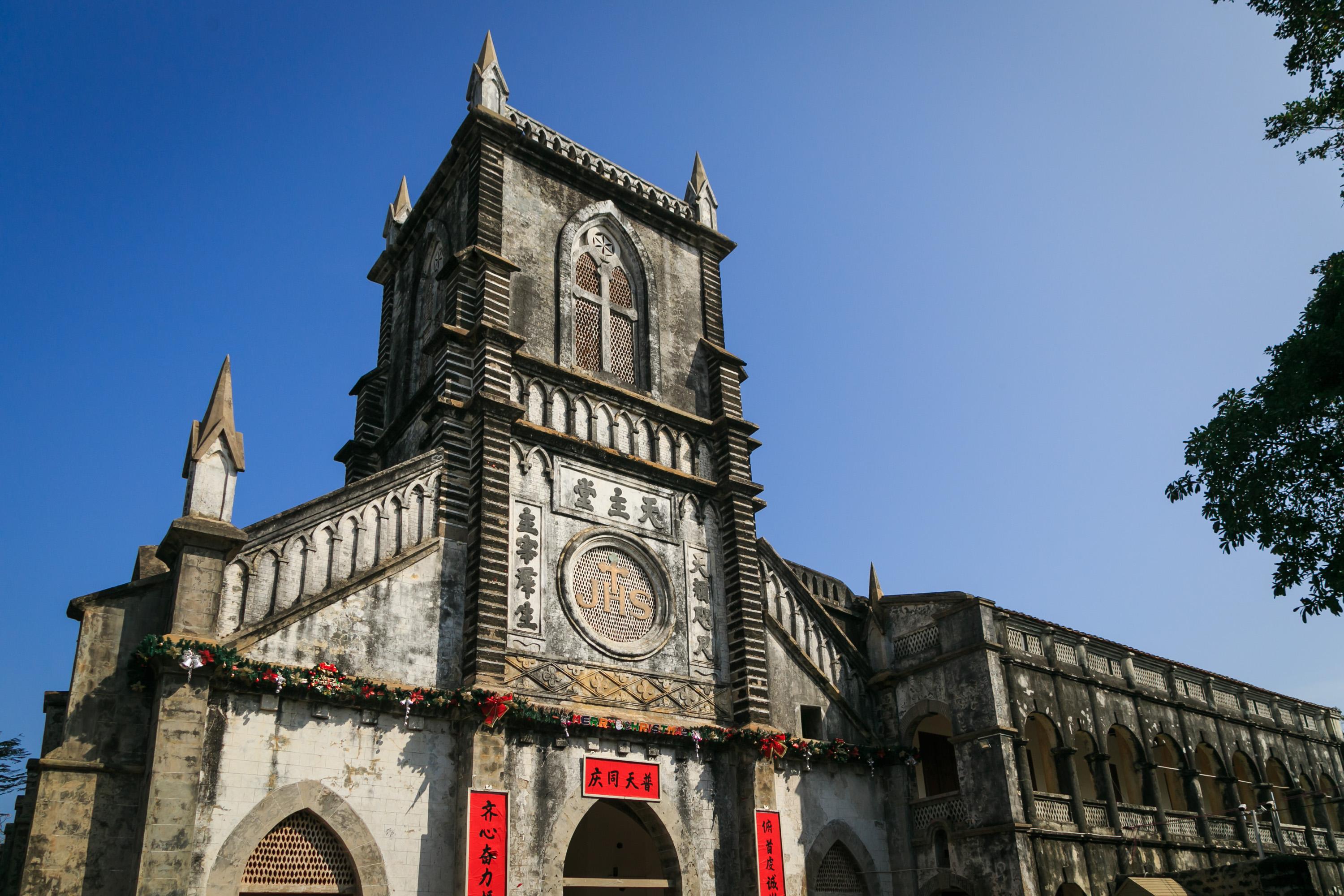 作为中西文化融合共生的历史见证者,天主教堂已走过了一百五十多个年头,它兴建于清代(同治八年),花了十年时间才建成了这座占地近千平方米,高达21米的教堂。跟普通建筑不同,天主教堂的建筑材料主要来源于当地的火山灰块石和珊瑚石。