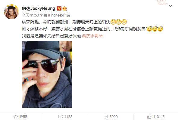 5月14日,向佐通过微博正式宣布与药水哥的拳击比赛,表示已经结束完了在内地的隔离,今晚将会抵达郑州做好应战的准备,并隔空喊话药水哥,希望他能够给自己买好保险,以防遭遇不测。