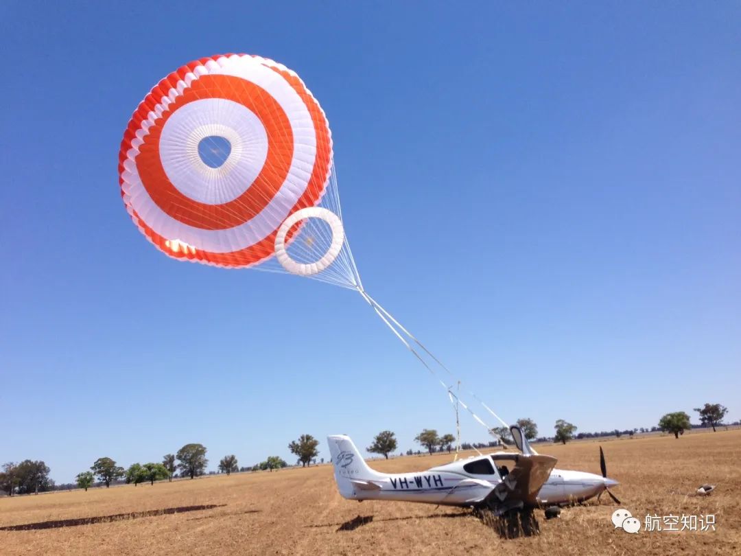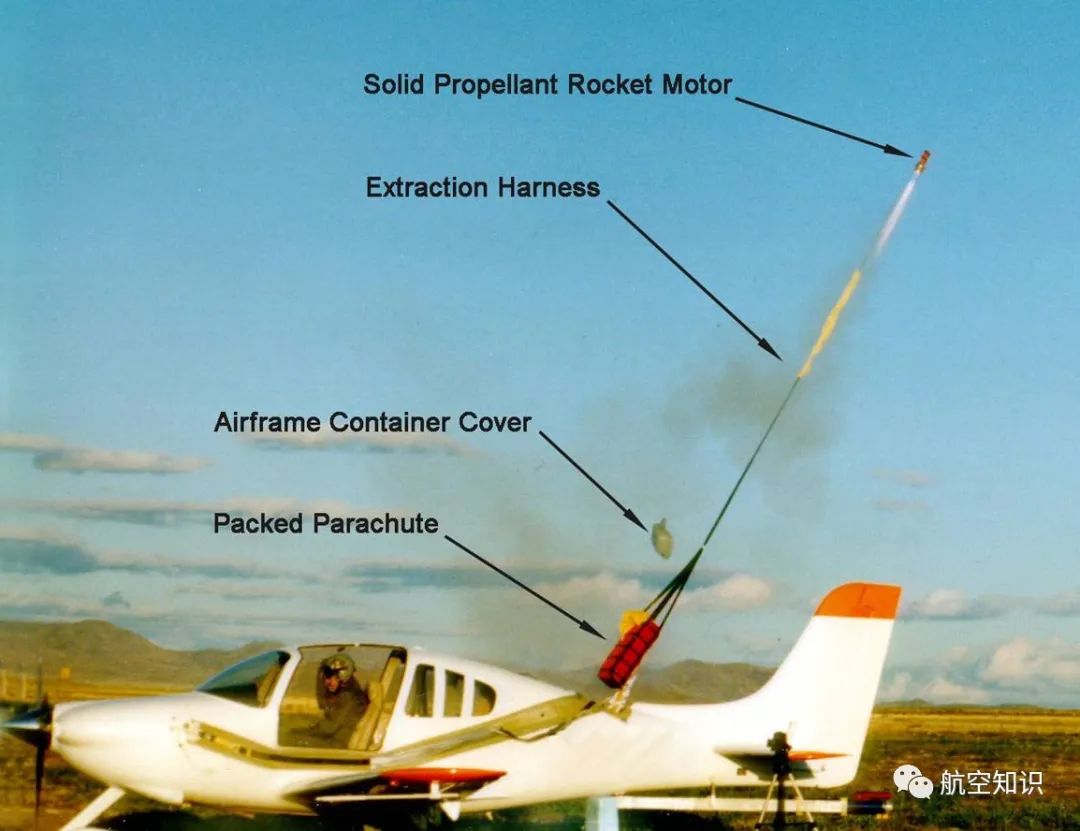 小火箭从飞机后部携带降落伞向后侧发射过程中,也将嵌在机身内的CAPS固定背带从机身带出。在几秒钟之内,直径近20米的伞衣即可展开,从而瞬时控制飞机的下降速度。