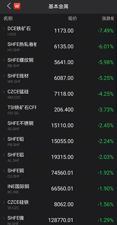 截至收盘,热卷、尿素跌停收盘;铁矿跌逾7%,郑煤、焦炭跌逾6%,螺纹跌近6%,线材跌逾5%,玻璃跌近4%,盘中均一度跌停。