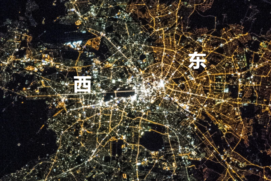 ▲柏林夜景卫星图,可看出东西部夜灯的明显不同