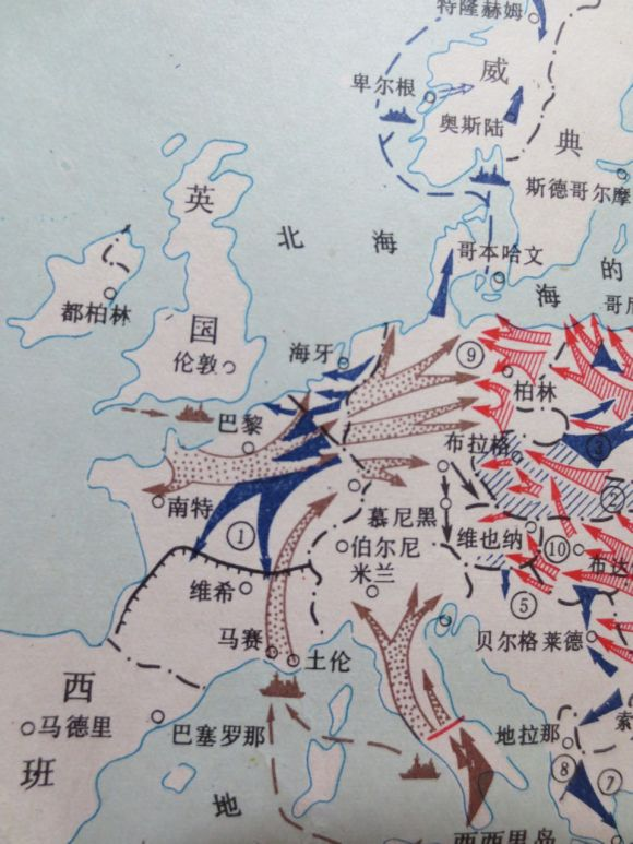 ▲1945年二战结束前夕东西线盟军对德国本土的进攻(褐色与红色箭头)