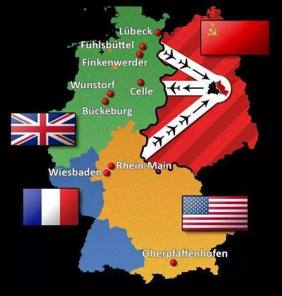 1948年前四大国在德国的占领区全归盟国管制委员会管辖,领导人为四国驻军总司令,而西方三国要前往各自的柏林占区,苏联也会按规放行。这样的局面直到东西德分裂才结束。