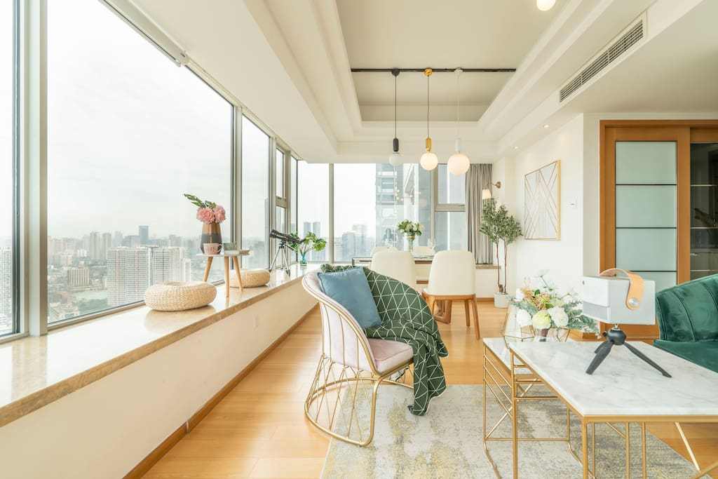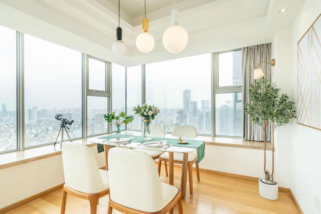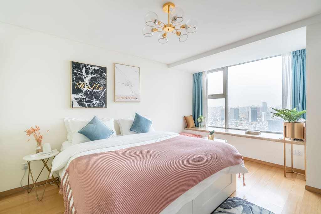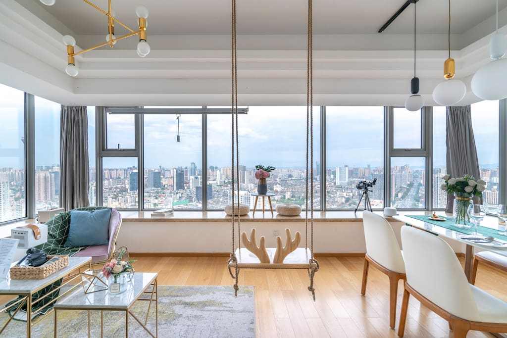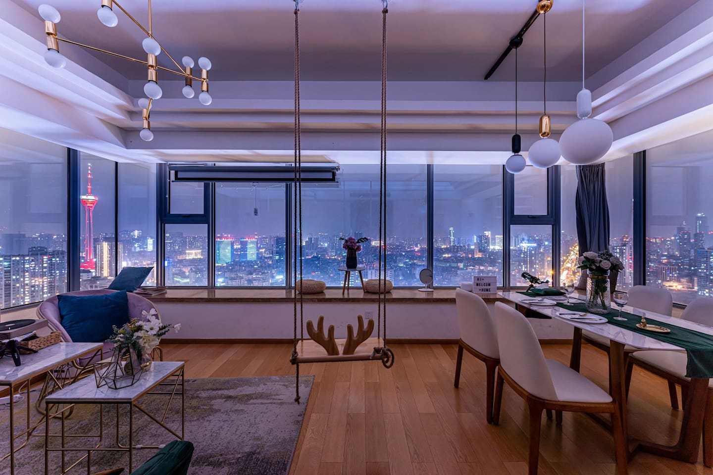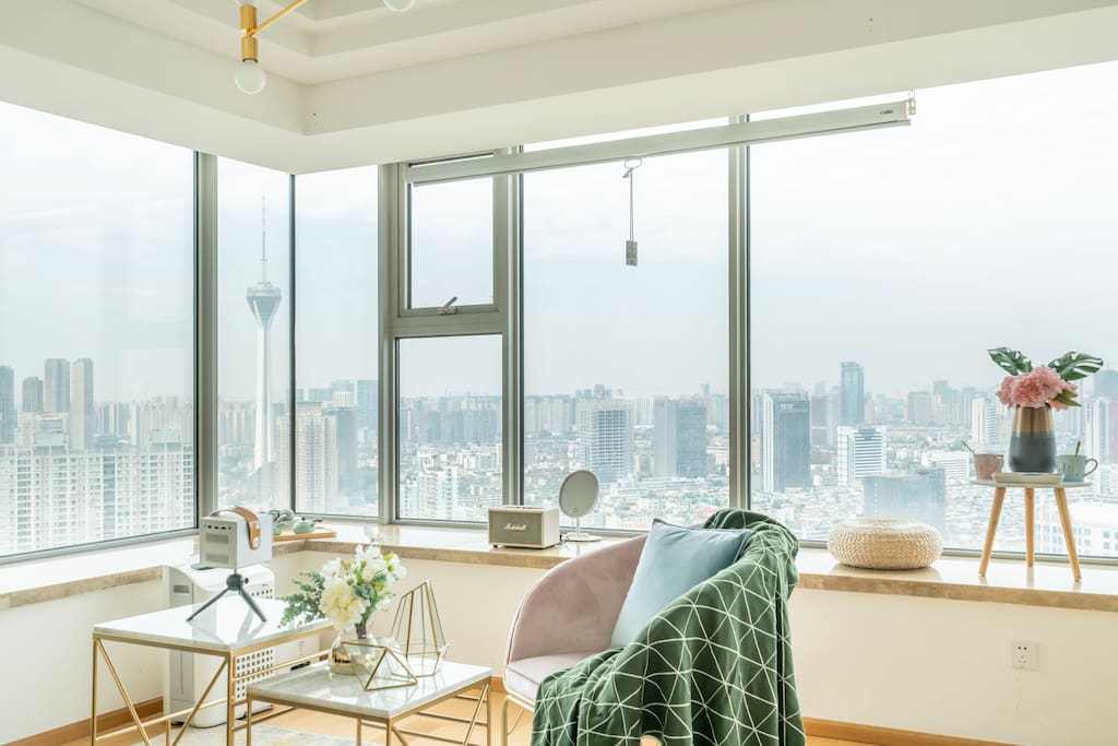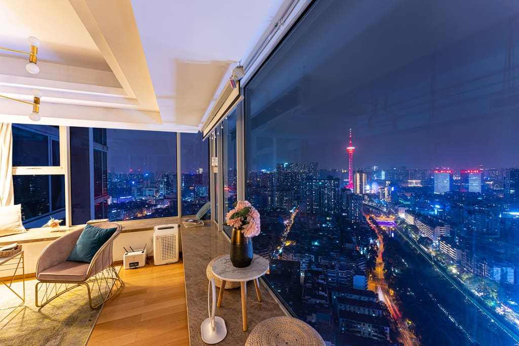 今天说的这家民宿在高层,而且是在成都市中心,所以到了晚上,可以清楚的看到城市的夜景,景色超级美,而且民宿在设计的时候就安装了超大落地窗,就是为了能有一个很好的视角去看景。