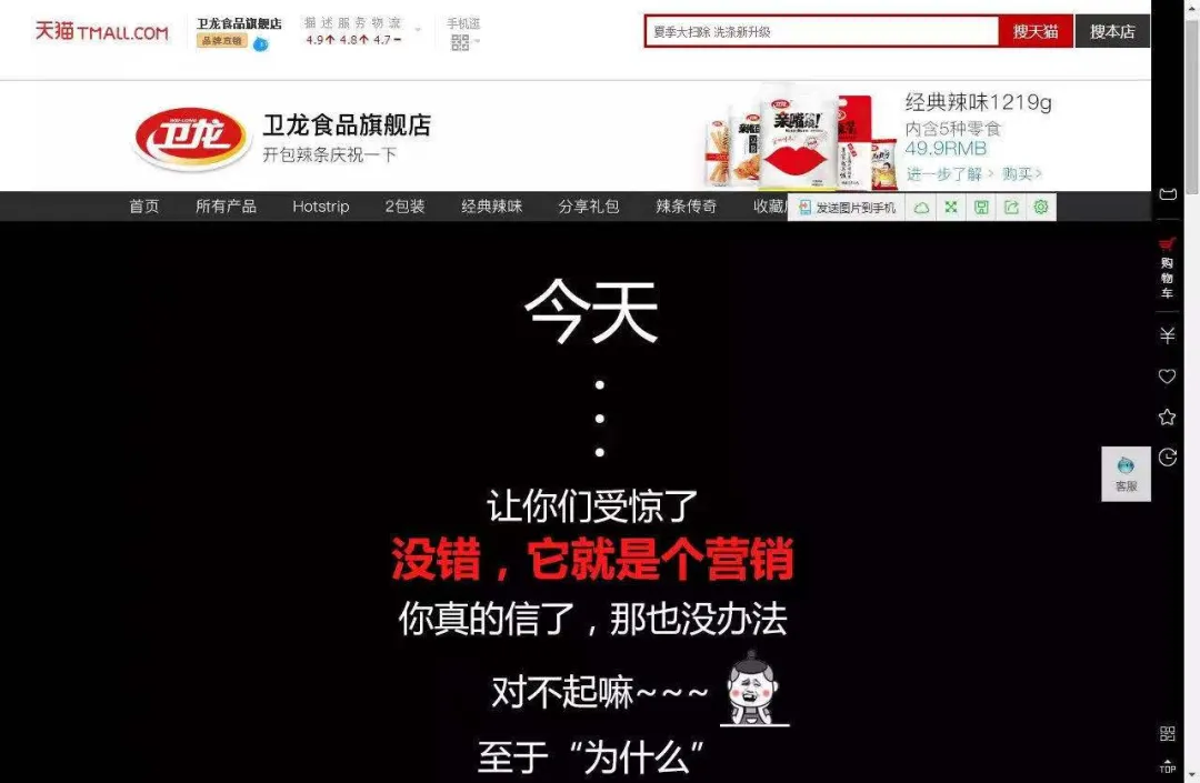 当年4月,卫龙天猫旗舰店被黑事件火遍全网。当时,卫龙天猫旗舰店主页被各种各样的表情包覆盖,官网还被用红色的字写满:“为什么不给我发货”。