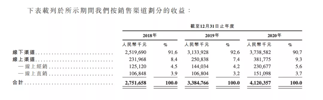 而在线上渠道,三年时间,收入占比仅增加了不到1%,其中经销商还分去了一半的份额。线上线下,通过经销商渠道销售的,超过了95%。