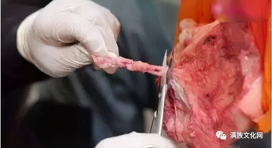 满族人杀猪,将猪脖颈肉剔下三寸宽的一圈脖圈肉,正经八经收拾出来,尤其是必须注意把猪脖子附近的淋巴腺体剔除干净,然后挂在杆子上冻上保留。春节时,专要吃这个脖圈肉。