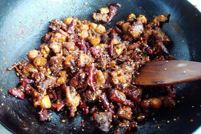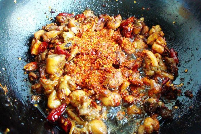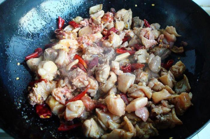 3、把腌制过的鸡块下到炒香后的辣椒中,用中火翻炒几下,将鸡块的水分煸干。