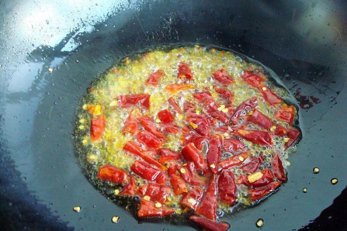 2、热锅凉油,下油300g后加热到3成油温(120度左右) ,加入辣椒段和花椒粒炒香(辣椒段40g花椒10g)
