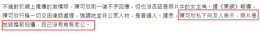 不过对于网上的爆料,陈可欣目前还未作出任何回应,只是表示一切交由律师处理。但也有人透露,陈可欣私下向友人表示,照片是自己婚前拍摄,自己没有婚内出轨背叛老公。