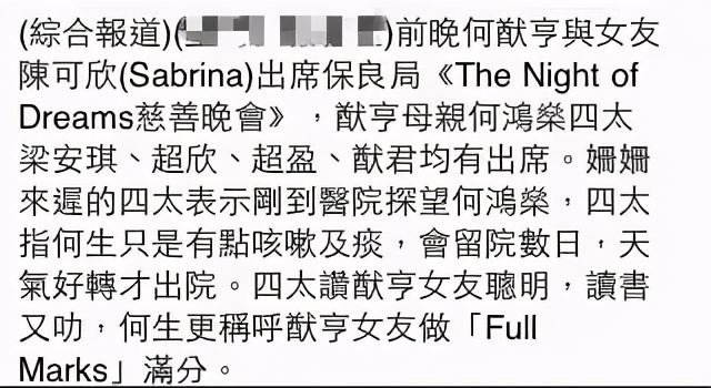 某次陈可欣跟着何猷亨出席活动,在活动中,四太梁安琪接受采访,谈及陈可欣时态度十分满意,甚至给陈可欣打了满分。