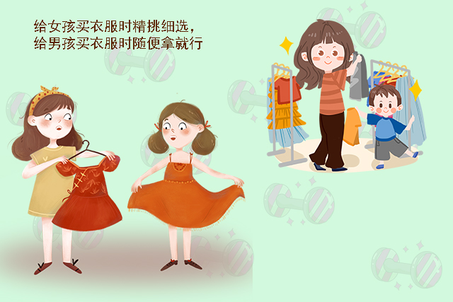 1.买衣服:给女孩买衣服时精挑细选,给男孩买衣服时随便拿就行。