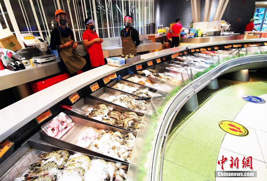 当地时间5月16日,菲律宾首都马尼拉CBD马卡蒂LANDMARK大型生活超市,海鲜摊档货品琳琅满目,售货员戴着口罩和面罩工作。从5月15日至31日,首都大马尼拉地区及邻近4省布拉干、甲米地、拉古那、黎刹(NCR Plus)以及其他一些地区,防疫隔离分类从“修订版加强社区隔离”降为更宽松的“一般社区隔离” 。封城”降级”的第一个周末,马尼拉商业恢复迅速。 中新社记者 关向东 摄