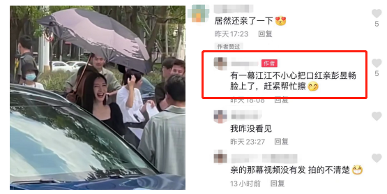 从视频中可以看出,在拍戏的间隙江疏影突然对着彭昱畅哈哈大笑,仿佛发生了什么事情。拍摄视频的网友解释称,是因为江疏影在拍吻戏时不小心把口红弄到了彭昱畅脸上,并表示因为拍摄问题,所以没有拍到吻戏的视频。