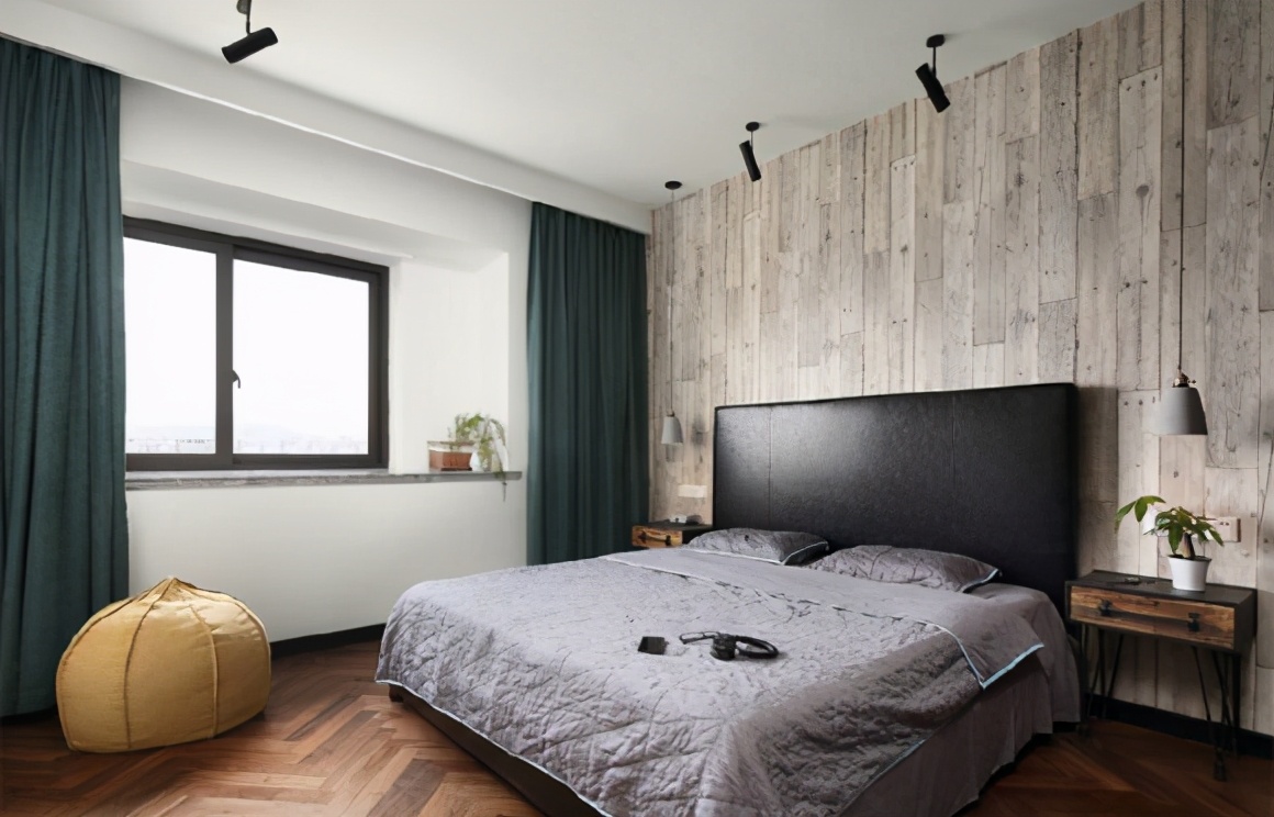 主卧室的装修效果,木板装饰的床头背景墙,配上黑色的皮艺床架和墨绿色的布艺窗帘,这样的卧室装修应该不会轻易“撞衫”了吧。