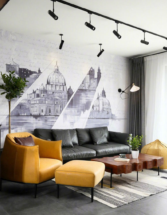 黑色、橙色的布艺沙发组合,再配上一棕色的异形茶几,高级、大气又极具设计感。沙发背景墙采用白色文化石来装饰,再贴上灰色图案的墙贴来点缀,这样的设计效果还真是不多见。