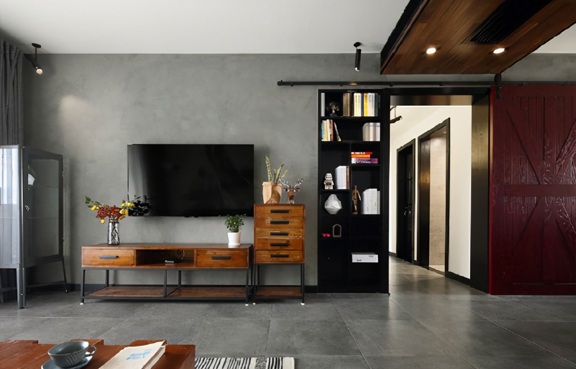 电视背景墙采用水泥色乳胶漆来装饰,再配上有点复古感的棕色电视柜,简洁大气又不失个性。