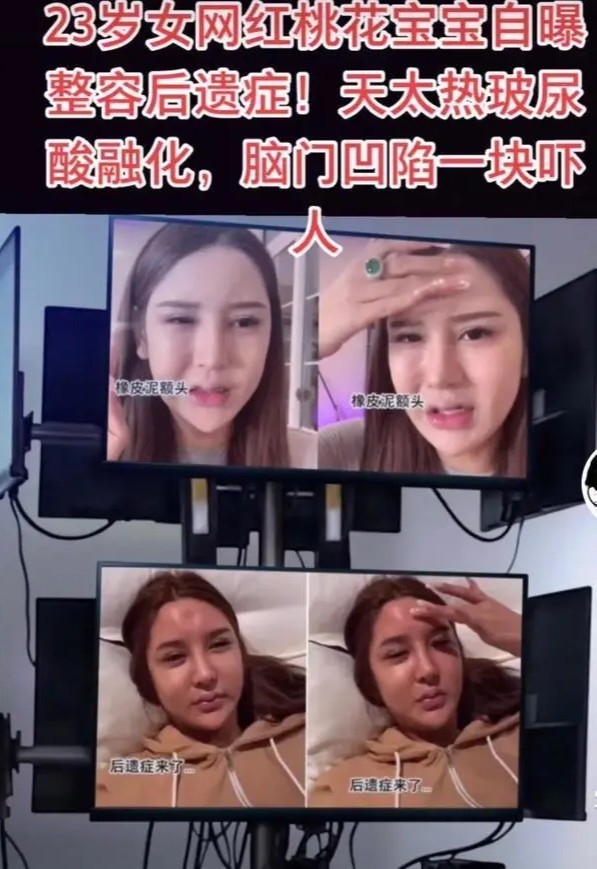 例如网红桃花宝宝就曾经自爆自己整容过后有很严重的后遗症,因为天气炎热而导致脸部填充的玻尿酸融化,额头还凹陷了一大块,看起来十分触目惊心。