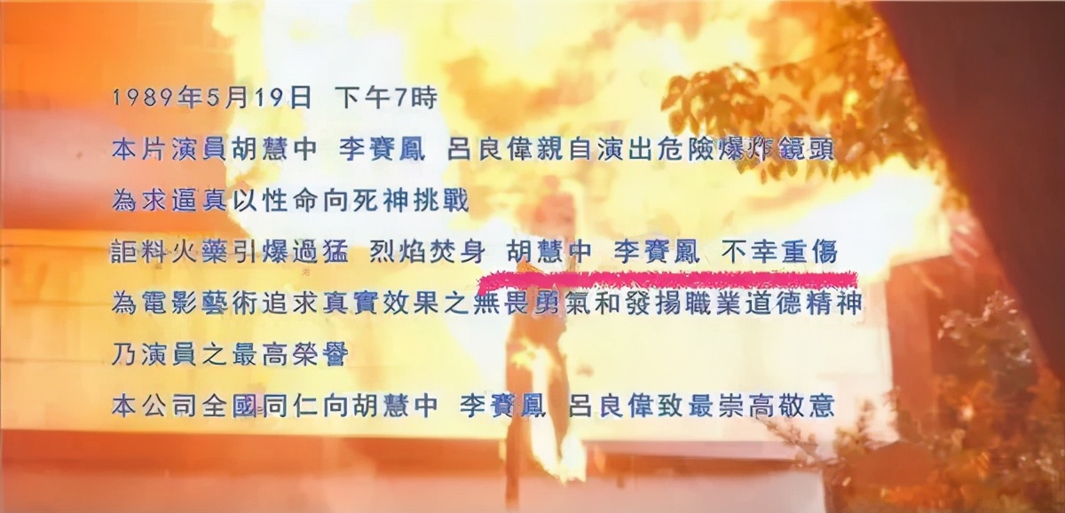 胡慧中在拍摄《猎魔群英》时,一场失误的爆炸戏让她在火光中从3楼直接被炸出来,同组的其他演员也受了重伤。