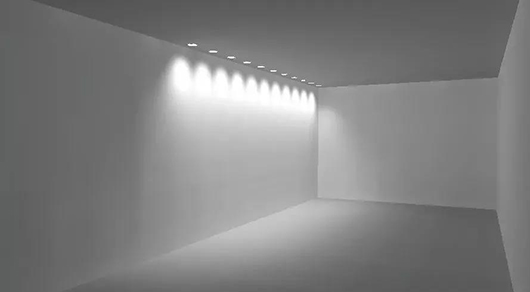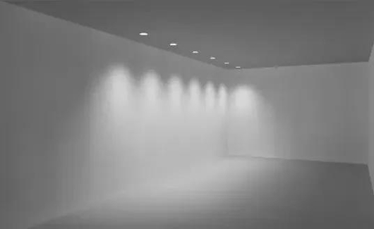 下照的筒灯均匀的排布在空间上方,提供整个空间地面的照面。尤其是靠近墙面的那一排灯对墙面的影响最大。拱门弧度大小受到灯具攻击束角的大小影响,上暗区的部分的高低也与灯具距离墙面的远近有关,灯具之间的距离则决定了拱门之间的距离。