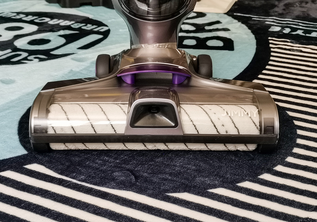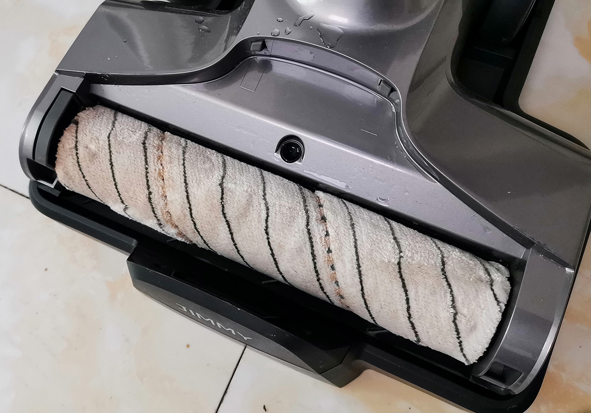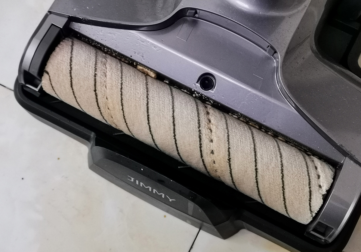 其次,吉米X8速干洗地机的滚刷也有所不同,其透明顶盖居中有一块凸起,这里是它的喷水口。扁平式的喷嘴可以呈扇形喷洒,喷洒的面积正好跟滚刷等宽,不会遗漏死角。