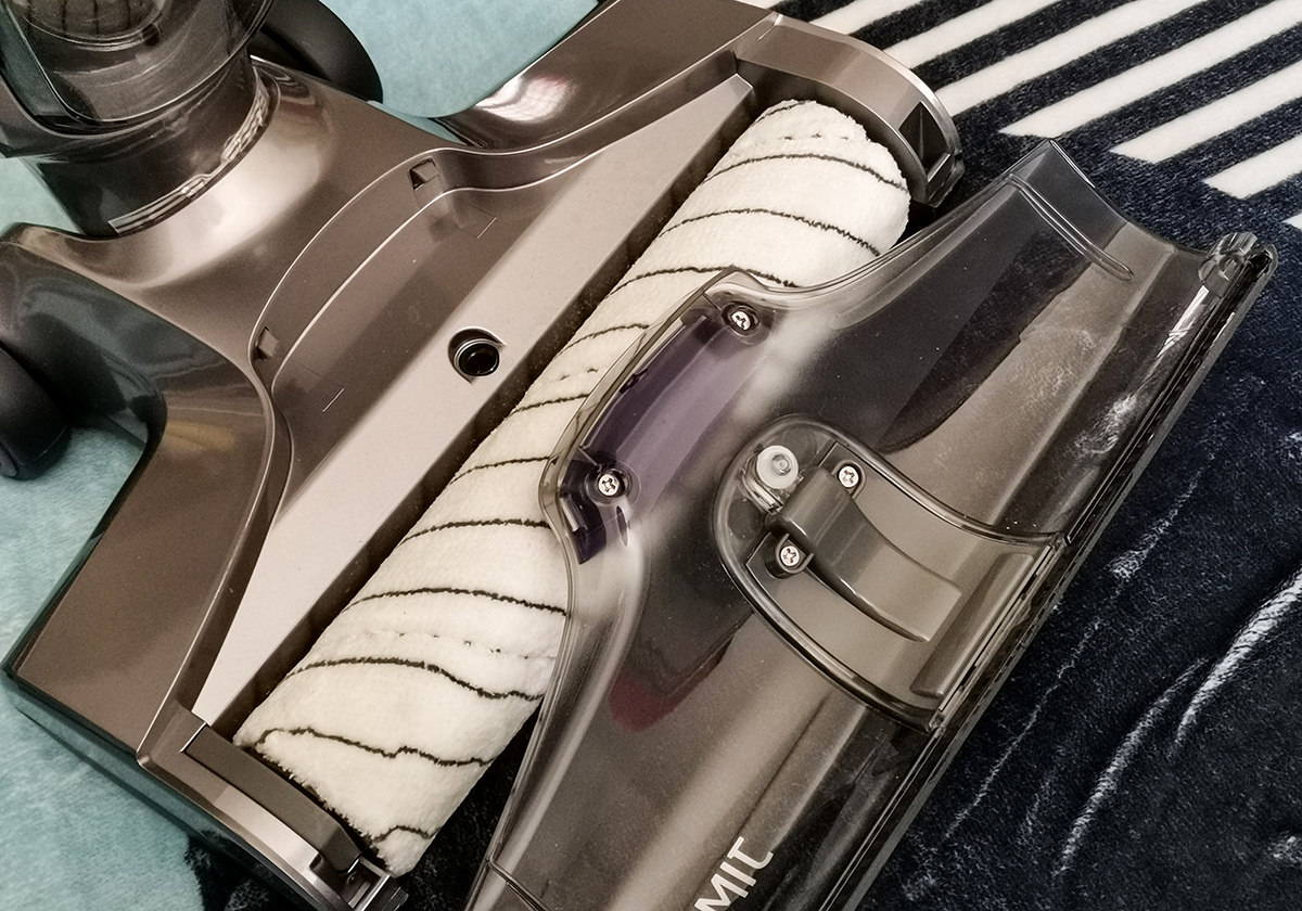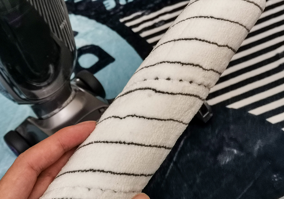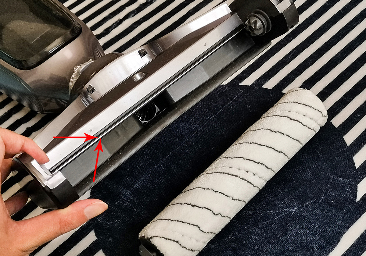 滚筒准确地来说是圆柱形的拖布,污渍和污水都收集在这上面,如何把它分离到污水箱呢?其实很简单,在内侧有一个金属刮水条,可以把它们都刮入污水箱中,基本上相当于边拖边洗,而且刮水条的边角很圆润,不会刮伤滚筒,保证经久耐用。