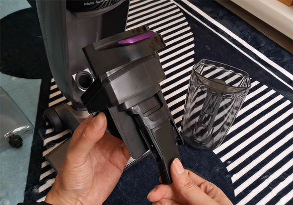 像清扫上面那种地板之后,滚筒往往会变得比较脏,此时可以把莱克吉米X8放在充电底座上,然后长按档位键开启自清洁模式。