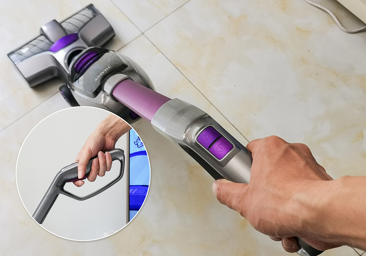 简单合理的构造也意味着操作的便捷,正面只有两个按键:开关键和调速键,其中开关键还兼具功能键的作用,可以在吸尘模式与吸水模式之间切换。