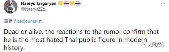 “不管死不死,大家对这个谣言的反应就已经证实了,他是现代历史上最受憎恨的泰国公众人物了。”