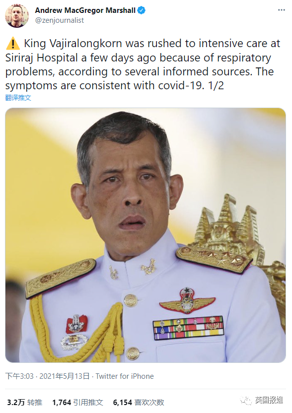 当地时间5月13日,那个极其熟悉泰国王室的英国记者Andrew Marshall他又又又带着大瓜来了。