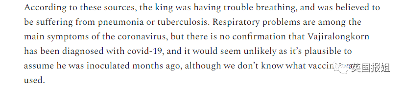 “据几位知情人士称,几天前,泰王因呼吸道问题被紧急送往诗里拉吉医院重症监护室。症状与新冠一致。”