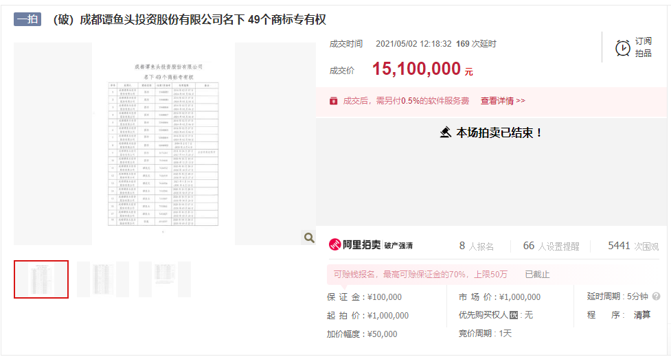 5月1日到5月2日,备受瞩目的“谭鱼头”名下49个商标在阿里司法拍卖平台,100万元起拍,经过188次竞价和169次延时,以1510万元成交。