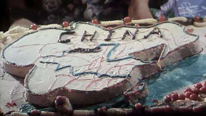 在日本挑起侵华战争之前,各国代表围坐在一起,分食一整块蛋糕,蛋糕上画着中国的版图,写着英文:CHINA。让人寒心的是,在这种情况下,中国的代表人居然也吃起了蛋糕。