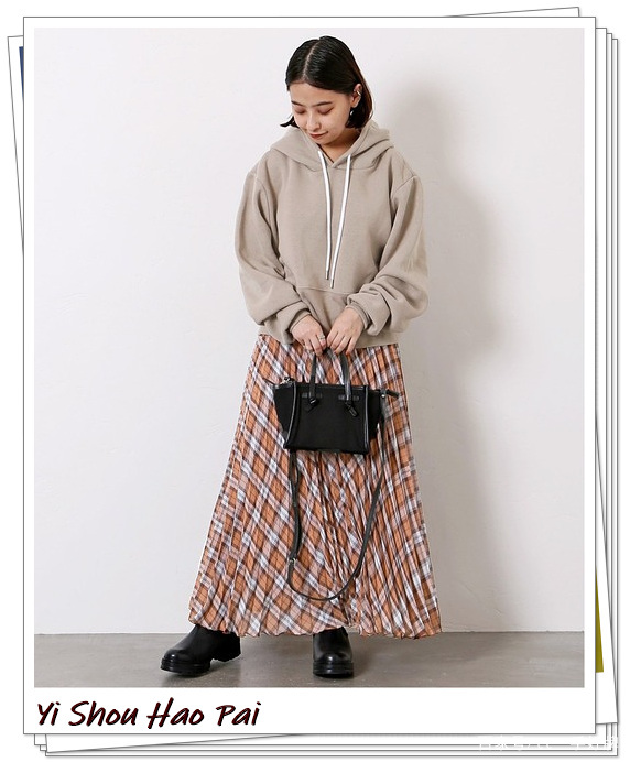 如果你将格子裙与卫衣搭配用,你会得到更多秋天的感觉。裙子还带有百褶设计,给人以女性化的可爱气息。由于是柔和的色彩穿搭,因此使用黑色配件来加强对比。
