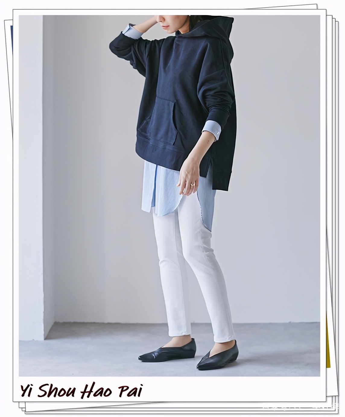 对于时尚的卫衣来说,还建议在内搭穿上衬衫以改变卫衣过于休闲的印象。长款的衬衫可以遮住腰部和臀部,看起来很时尚。白色裤子营造出清新的氛围。