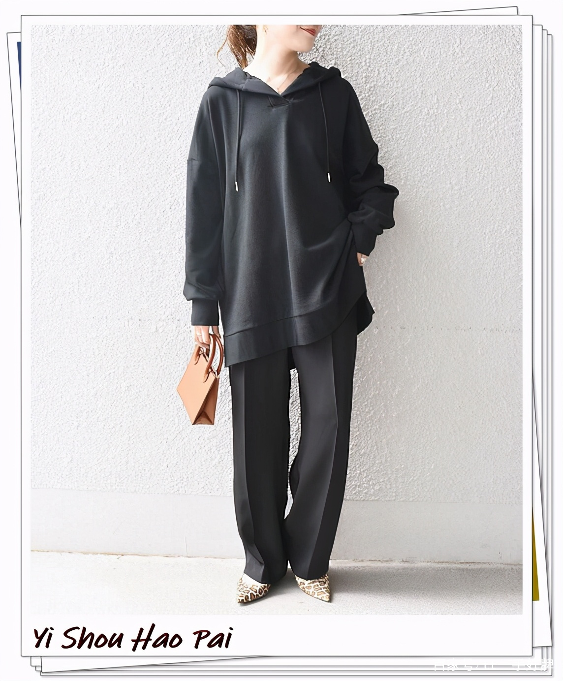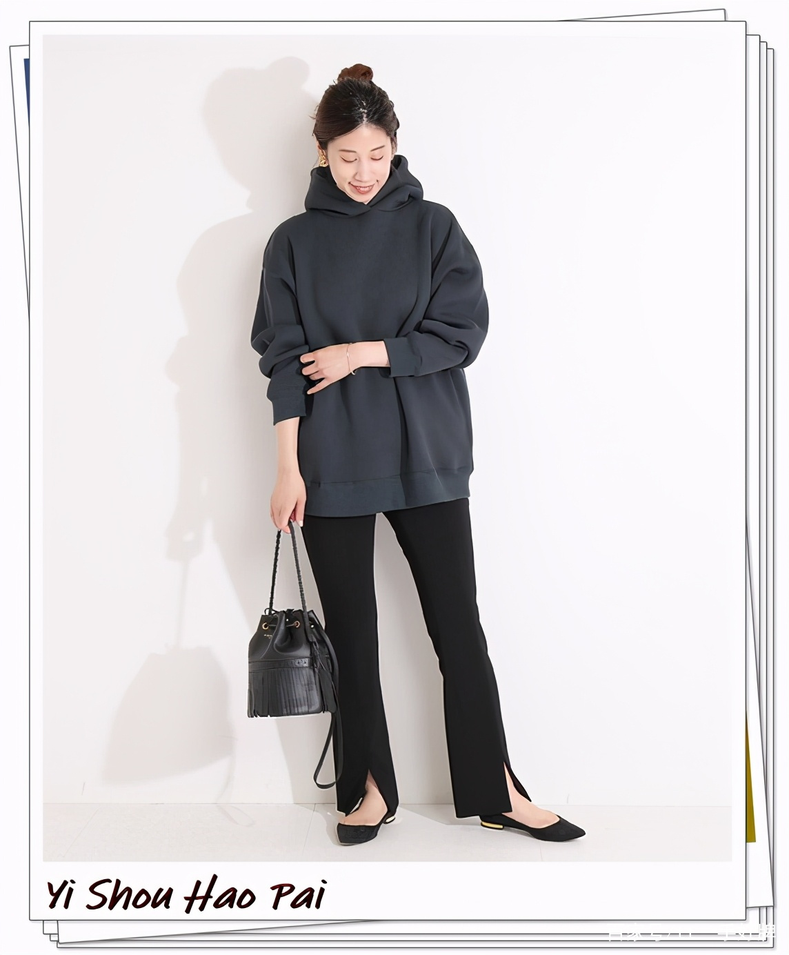 如果你将经典百搭的卫衣与时髦的开叉裤一起穿,也可以很适合轻熟女人。裤子纤细美丽的轮廓自然散发出女人味。选择美丽的平底单鞋,透过开叉露出脚踝,即使全黑的造型也没有沉重感。