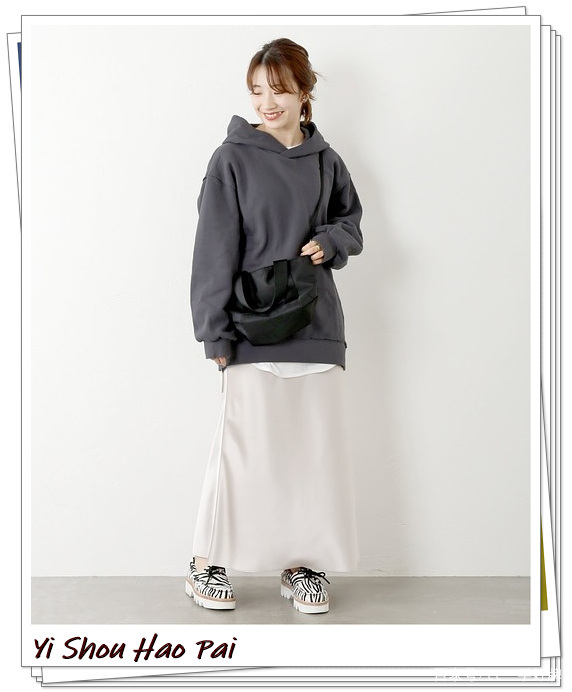 深灰色卫衣与米白色裙子搭配,采用沉稳的配色方案。如果你想增加一点流行感,建议选择有图案的鞋子。别致的配色,并具有很好的亮点。
