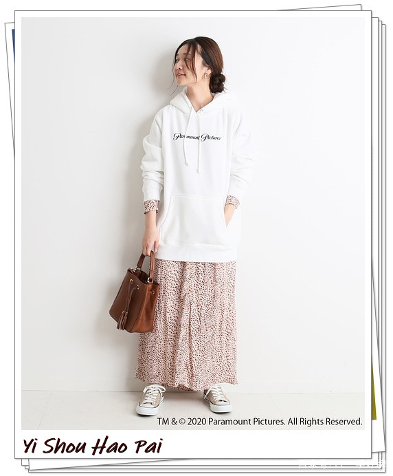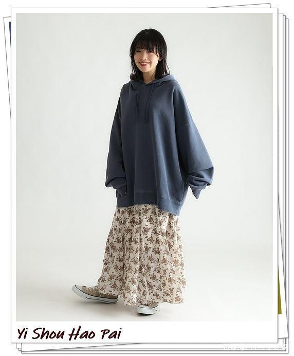 卫衣搭配女性化印花裙非常好。对于时尚的V领卫衣,我们选择纯白色以提高简洁感。oversize卫衣与流行的百褶裙和缎面裙都可以搭配得很好。