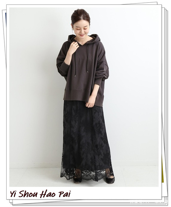 蕾丝裙搭配休闲卫衣的美丽风格。这是一种别致的氛围。如果你拉起卫衣的袖子,以便可以看到手腕,你会有一种轻松的感觉,而且会很时髦,可以消除暗沉颜色造型的沉重感。