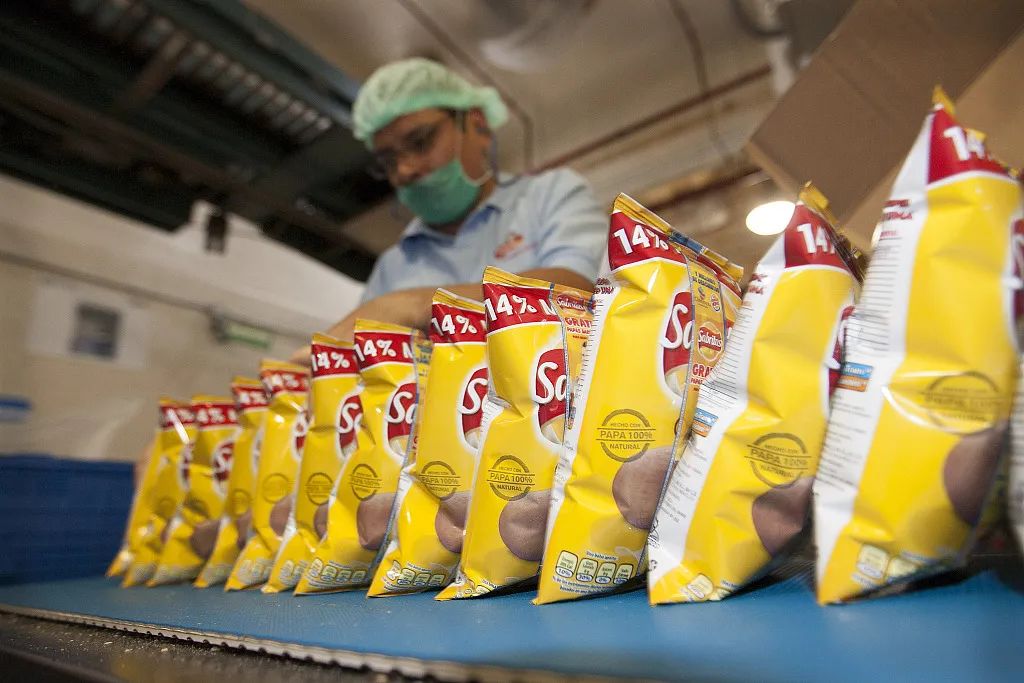 当地时间2012年8月14日,墨西哥一薯片加工厂员工正在打包袋装薯片